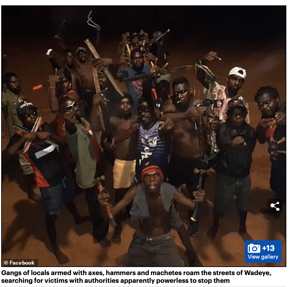 去年5月,大量原住民成群结伙地、手持斧头、锤子、弩等利器,在街上走来走去,肆意点燃房屋和车辆。