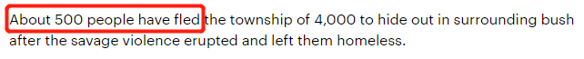 不断的暴力冲突已经让当地大约500人流离失所,母亲带着孩子们背着毯子藏进小镇周边的灌木丛中,席地而睡,等待救助。