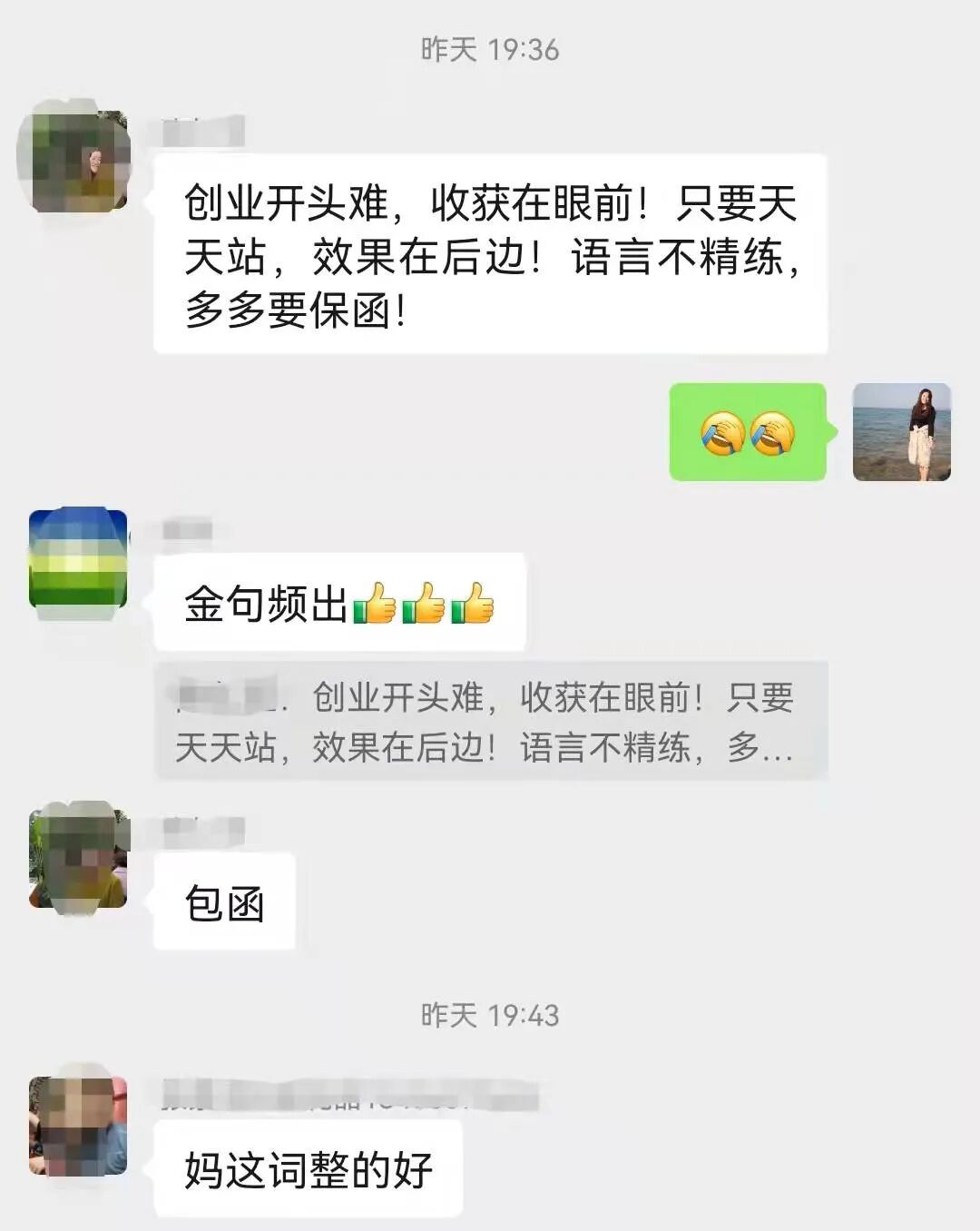 我妈很快发过来一段话:“创业开头难,收获在眼前!只要天天站,效果在后边!语言不精练,多多要包涵!”