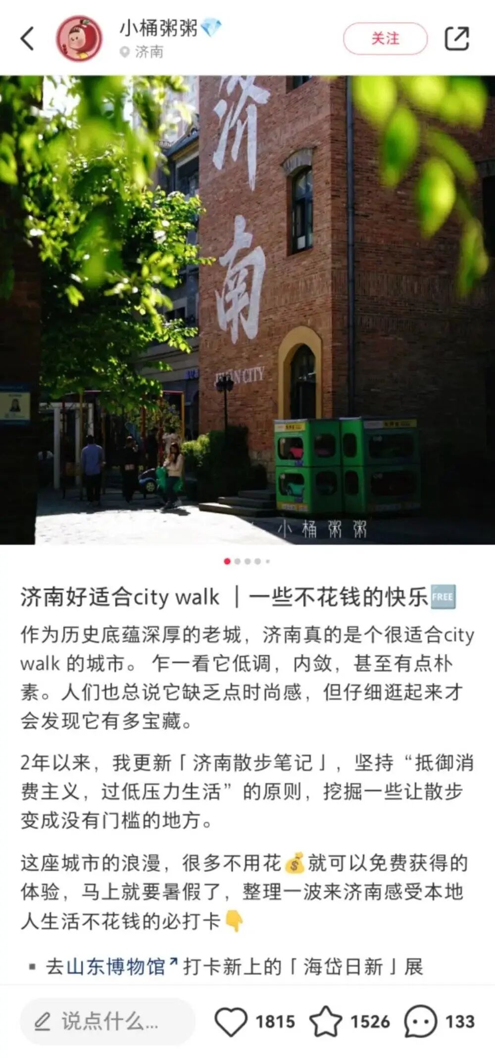 在这个过程中,City walk将城市中的人文资源与自然遗产持续激活,地方政府也乐得推动文旅的融合与升级,不少城市已经将Citywalk列入了地方文旅规划方案,上海还专门开设了公交巴士组成的City walk专线。然而,若将City walk视为一种旅游产品,它的变现之路异常艰难,在小红书,不少用户将其称作“不花钱的快乐”。