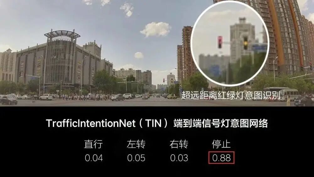 其次,在“看红绿灯”这件事上,理想训练了一个端到端的信号灯意图网络(TrafficIntentionNet),简称为TIN网络。不需要人为设定任何规则,甚至不需要识别红绿灯的具体位置。只要将图像视频输入给TIN网络模型,网络就能直接给出车辆现在该怎么走的结果——左右转、直行或停止等待。此外,理想还通过学习人类司机在路口对信号灯变化的反应,来训练TIN网络模型。