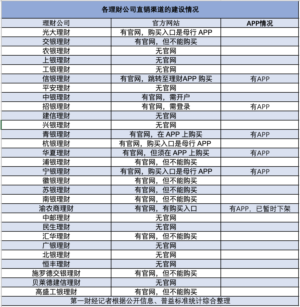 不过,第一财经记者发现,目前各银行理财子在线上直销矩阵搭建方面的进度差距较大。根据普益标准统计,目前大多银行理财子公司都注册了微信公众号,有17家开设公司官网,仅5家有APP。在银行理财子公司中,大多微信公众号仅作为对外宣传、进行投资者教育的窗口,并未直接提供交易关联服务,目前仅信银理财、青银理财可以直接通过公众号链接进行购买,建信理财、华夏理财、施罗德交银理财则在产品展示信息中附带二维码,客户可跳转至银行APP购买。
