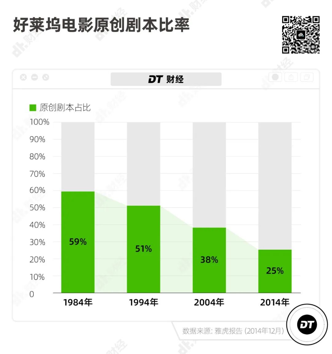 电影产业专家Stephen Follows曾统计过1995年-2014年好莱坞剧本来源情况,他发现好莱坞的原创剧本比例从2004年开始就呈现大幅下滑趋势。雅虎娱乐在2014年末发布的报告中也指出,好莱坞六大电影公司的原创片在2014年仅有25%。