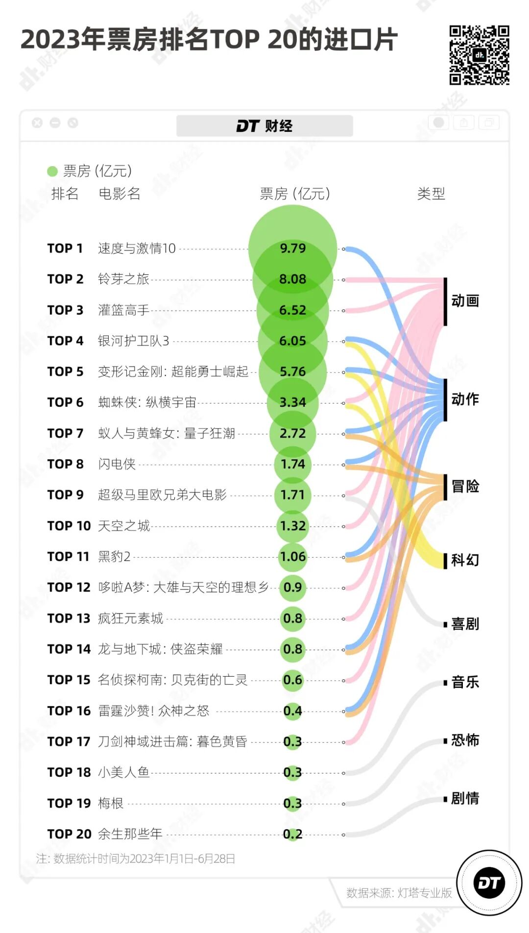 今年排名前三的进口片中,有两部是动画电影:《铃芽之旅》和《灌篮高手》。上映前被认为可能不符合中国观众口味的动画电影《蜘蛛侠:纵横宇宙》,也拿下了3.34亿票房。