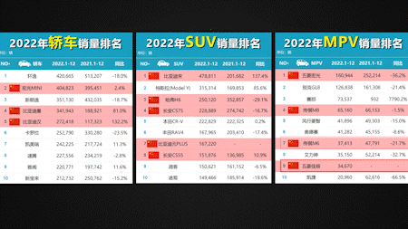 很多年前,哈弗H6、五菱宏光就曾常年登顶销量冠军,而今天的销量榜上,除了众多20万以下的国产家用车在轿车、SUV、MPV销量榜上的亮眼表现之外,更值得注意的是高价位车型。起售20万元以上的比亚迪汉在2022年销量超过27万,排名轿车销量榜的第5名。