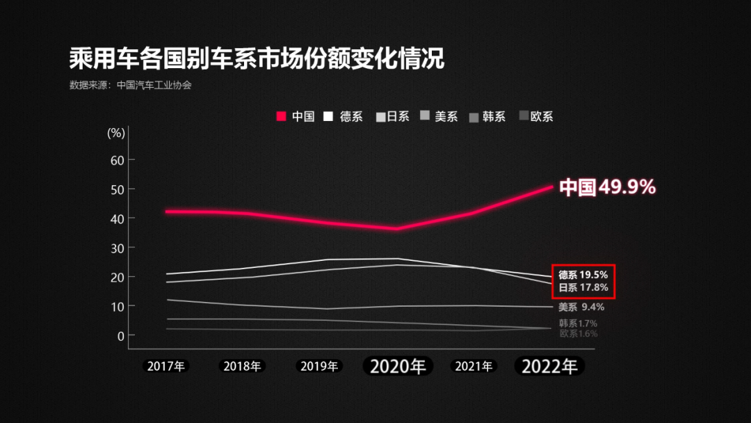 整个2022年,自主汽车品牌的市场份额达到49.9%,与2020年对比,短短两年时间,增加了10个百分点,这些份额几乎全是从曾经最受欢迎的日系和德系品牌那里抢到的。