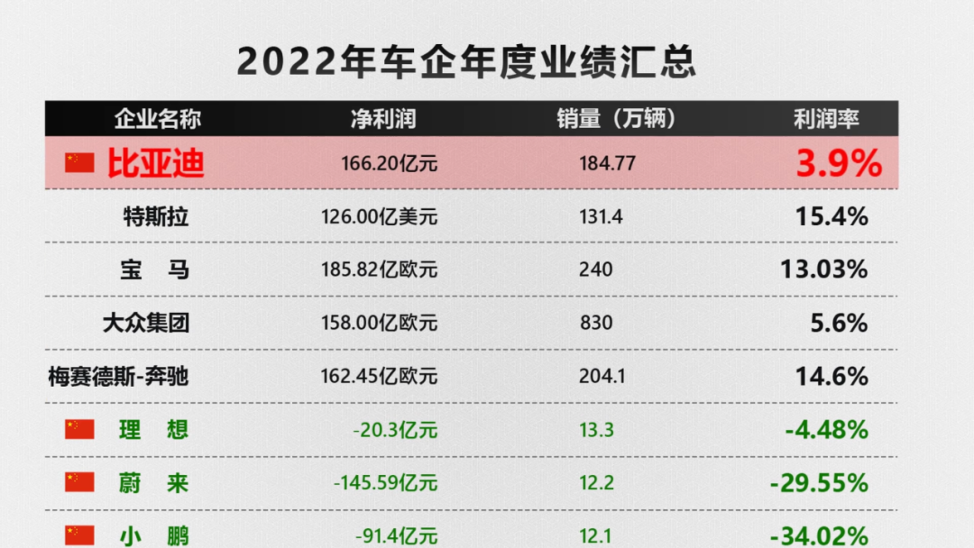 同质化的竞争,也就导致想要销量,就只能降价。虽说咱们消费者对降价这事喜闻乐见,但亏本卖车肯定不是长久之计,现阶段国产新势力普遍处于亏损状态。而作为龙头的比亚迪2022年的净利润率也只有3.9%。而通过这张表格,与海外汽车巨头的利润进行对比,可以看到,特斯拉15.4%的利润率是多么恐怖。