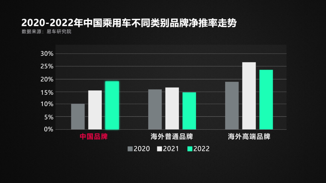 除了销量数据,在满意度或推荐率方面,国产汽车也有了长足的进步。根据咨询机构的数据,中国品牌在2022年的推荐率首次超过国外非豪华品牌,这也说明越来越多的车主在向身边人推荐国产车。