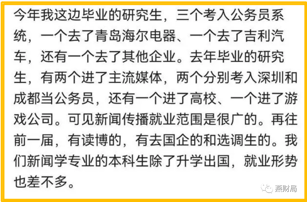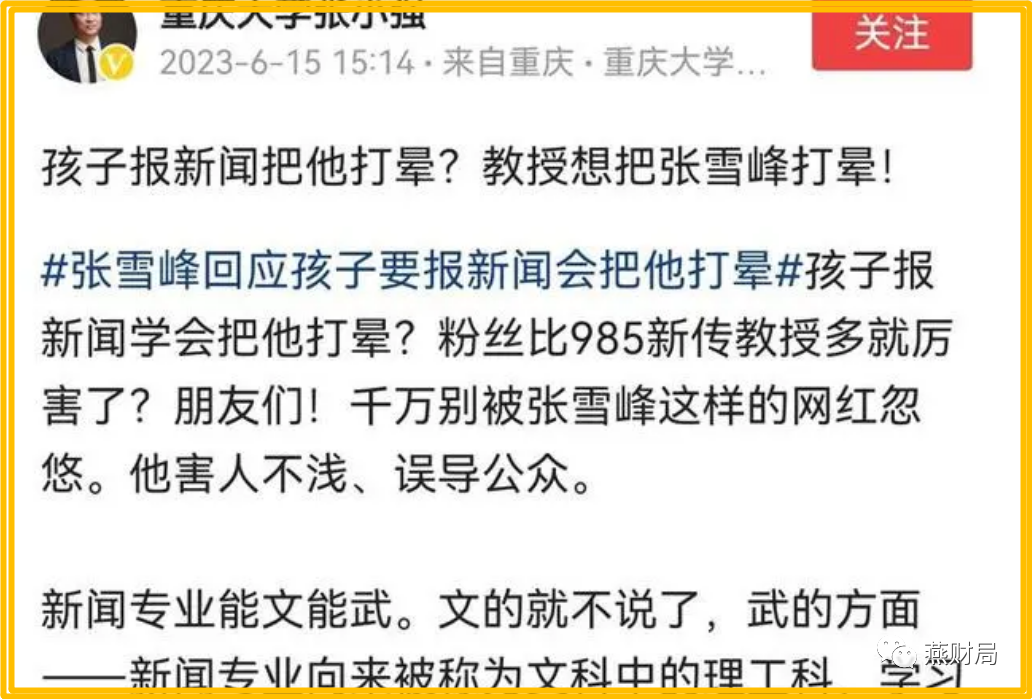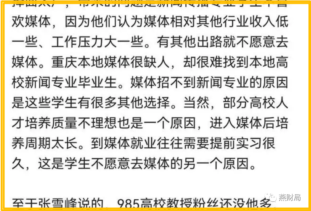 分数一出,全家老少齐上阵,这几天对于众多家长来说,天大地大都没有填报志愿大。因为毫不夸张的说,填报志愿的这几天甚至能决定未来几十年人生路径和方向。但这里牵扯到一个极为重要的问题,该怎么选,到底是听家长的、听老师的、听教授的还是花重金听张雪峰这种专业人士的一句劝?!前几天各种查分哭与乐的场面刷屏,搞的我心里一直惦记着聊几句,特别是有教授站出来怒批张雪峰不让家长选择新闻学之后,更想聊一聊。作为过来人,我想很多人太知道同样分数不同专业、不同城市、不同背景、不同平台,区别有多大了!对于大部分学子来说,家庭背景基本相差不大,在这个前提下,选对专业、城市就尤为重要。有的专业不用毕业即意味失业,有的专业明显不愁就业。甚至,分数相同的两个学生,选择不同的专业、不同的城市,十年之后就可能是一个天一个地,同学聚会上“一见高下”,背地里成为被嘲笑对象。我现在还记得很清楚,高考填志愿那会非常纳闷,学了十来年就为考大学,偏偏学校里不开设专门的填报志愿指导课程。太多学生都是糊里糊涂拿到一本指导书,从书上第一次看到大学名字,但完全不了解里面的一些专业是干什么的,又能干什么。至于问家长,不好意思,大多家长更是两眼一抹黑,做父母的只知道让孩子吃饱穿暖学习好然后考个好大学,对于挑什么样的大学、找什么样的专业,家长往往比孩子还糊涂。我考大学那会很多同龄人的爸妈都没上过大学,现在的家长许多都经历过高等教育,相对来说越来越多的家长也懂得研究这个盲点,但不能否认的是,每年一千多万考生,没办法自己去研究明白怎么报考怎么选专业的占绝大多数。截至2022年我国有3000多所大学,其中本科1270所,专科院校1400多所,根据最新的教育部专业目录,大学本科总共分12个门类,93个大类,792个专业。回到开头的问题,填报志愿,该怎么选,到底是听家长的、听老师的、听教授的还是花重金听张雪峰这种专业人士的一句劝?这么多的门类和细分专业,家长也罢,老师和教授也罢,都不可能在短时间内搞得明白,术业有专攻,他们在这块是外行。张雪峰团队吃的就是这碗饭,赚钱的同时也确实帮到不少人,人家干的就是这份职业。所以之前我刷到张雪峰的那个视频,还给点了赞,因为我觉得在这块他有发言权。视频里他对学生家长说,“理科590报新闻?你会崩溃的。”“别报新闻,从中国本科专业目录里面闭着眼睛摸一个都比新闻好。”“如果我是家长,孩子非要报新闻学,我一定会把他打晕,然后给他报个别的。”没看过原视频的可以去找一下,原视频比我说的更具体。张雪峰表示新闻传播曾经是很好的专业,那时候媒体兴盛,电台、报纸、电视台还有网站的编辑记者,而现在每个人都是自媒体,学新闻传播的80%都没有从事本行业的。老张讲的爽快,没想到很快有教授出来痛批他“害人不浅、误导公众,千万别被这样的网红忽悠”,并且现身说法,表示自己的几个研究生去向都不错,“重庆本地媒体很缺人”、“媒体招不到新闻专业的原因是这些学生有很多其他选择”,等等。从这位张教授的字里行间就能明白,其实两人根本就没站在同一个层面看事务,典型的鸡同鸭讲。一个表示要选对大学选对专业,让自己未来好就业,能吃饱饭。一个不但吃饱还早已吃好俯视众生,看到的只有拔尖的那几个学生。光画大饼却不解决问题,别人解决问题赚钱又这不对那不对。每个人都是自己的第一责任人,真填报志愿,或多或少都会在理想和现实之间反复横跳。最终要怎么选,就像掷色子一样,买定离手,后悔最没卵用,虽然很多人照样后悔。但至少大家都一样,是凭本事考出的成绩,凭成绩填报的志愿。