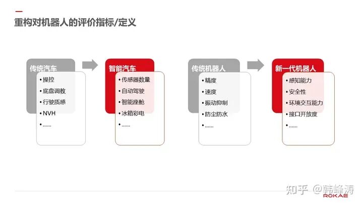 展望 对机器人行业的影响 与计算机、手机、汽车等行业相比,AI与机器人产业尚处于早期发展阶段,大模型的能力与机器人的能力其实还没有强关联,是传统意义上“完美机器人”的两个独立又关系密切的组成部分,类似于计算机的软件和硬件。 因此,在可预见的未来,包含AI和机器人的泛机器人产业圈,会分化为两类公司: 以机器人核心零部件、精密控制为核心的机器人公司,为行业提供机能强大、高度开放、成本可控的机器人标准产品; 以行业大模型应用技术解决某些细分场景/行业的机器人应用产品公司,基于大公司提供的基础模型+其在行业的Know-how,提供行业的整体应用解决方案(包括软件和硬件); 在这个假设下,对于机器人产品的评价指标与定义即将发生变化。 就像汽车领域,一直以来汽车作为交通工具,其主要功能是把人从A点移动到B点,交通工具的主要关注点是操控性、通过性、底盘调教、质感。随着汽车电动化、智能化的发展,现在汽车更多关注传感器能力、自动驾驶水平、座舱智能化程度、甚至冰箱彩电等。车还是那个车,但是定义什么是好车的参数和指标发生了变化。 机器人同理,之前机器人关注精度、速度、振动抑制等等,未来可能更关注感知能力(多少种传感器)、安全性、操作简易化水平、环境交互能力、接口开放程度等。