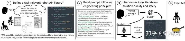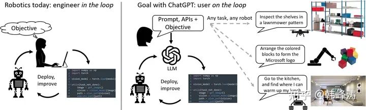 具备工业/商用/服务领域通用性的机器人控制软件(机器人大脑)有了实现的可能 机器人的未来将继续考验行业内外许多人的智慧与能力,但是在历史洪流的发展进程中,新的拐点或者机遇终将如期而至。 把任务分解为动作(把从拿杯子到打开水龙头到接水的过程拆分成一个一个的细小动作) ; 机器人工程师根据分解动作对机器人进行编程,生成代码(可以是C++、Python,也可以是自定义的机器人编程语言) ; 控制-执行-反馈(传统意义上机器人控制的主要功能) ; 在大模型之前,一般只有第四步的控制和反馈环节是由计算机自动完成,前面的任务定义、拆解和机器人运动代码生成主要是机器人工程师完成。众多的机器人应用工程师的主要工作就是理解任务,并把任务拆解成合适的动作,使用机器人编程语言完成机器人应用程序的编写、调优和部署。 大模型并不适合做底层精确的控制,更适合做相对模糊的任务级规划。通过大模型直接生成机器人应用级代码 是目前看来技术储备最多,最有可能快速落地的方向。 例如,如果要求机器人去厨房接一杯水过来,那么仅仅是打开水龙头这一个子任务对机器人来讲就有很多挑战,水龙头的样式是多种多样,开启方式也不尽相同,机器人首先要能理解面对的是一个什么样的水龙头,该如何开启,开启到什么程度能兼顾接水速度和避免泼溅和溢出。这个对于人类来讲很简单的事情,在之前都是需要机器人应用工程师通过代码一行一行写出来的。而预训练大模型的通识理解能力和强大的零样本学习能力,非常适合生成动作级代码,指挥机器人的动作来完成任务。 当然,靠AI完全自主生成的机器人代码可能存在不完备、不安全的问题,这时候就需要人类介入(RLHF)进行确认、修改、调优等工作,通过AI与人类的配合,来实现机器人的低门槛使用与快速部署。 定义任务级API--设计Prompt让模型理解API--大模型生成程序↔人工修正--人工确认ok后执行 有关机器人任务级编程的更多介绍, 这里还有一篇非常详尽的文章可以参考。 https://www.zhihu.com/question/58830644/answer/159511581 从工程师到用户 当大模型带来的任务级编程/交互在各个应用领域陆续落地的时候,机器人的使用者从工程师变成了一般用户 。 大模型的few-shot和zero-shot能力,让机器人在面向各种各样新应用时,可以快速给出一个方向正确&基本可用的整体方案,而且不需要用户具备之前需要的专业机器人知识。