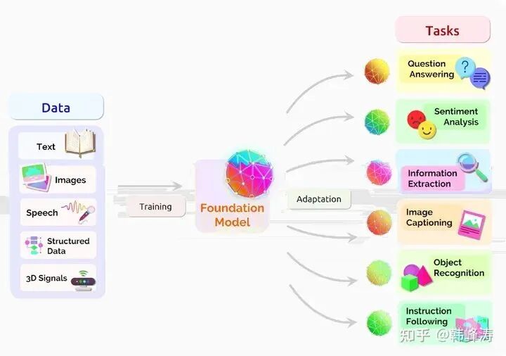 使用多种模态数据训练出基础/基座模型,然后再微调应用到各种细分行业应用中去,变成行业大模型