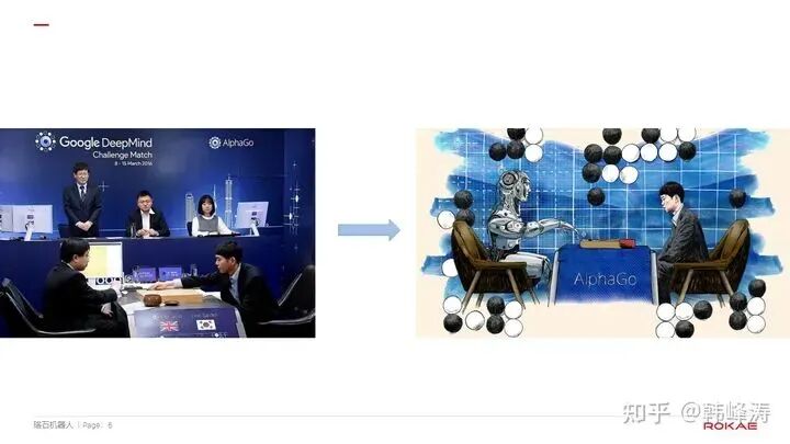 使用门槛的降低,是一个产品或一个产业走向大规模快速爆发的起点。 机器人是AI与物理世界的锚点 AI系统生成的指令,凡是需要与外界环境进行物理交互的,都需要机器人来完成具体的动作,机器人是AI系统落地物理世界的最佳载体。 我们生活在三维的物理空间,里面发生的几乎一切事情都需要与周围的事物进行各种形式的物理交互,而AI作为计算机软件系统,要想与外界交互,必须借助物理实体来完成。当年AlphaGo与李世石对战时,仍然需要人类代为执行移动棋子的动作,其实完全可以换成一个机器人/机械臂来代替这个人。 李世石与AlphaGo对战时,代表AlphaGo下棋的人可以换成机器人