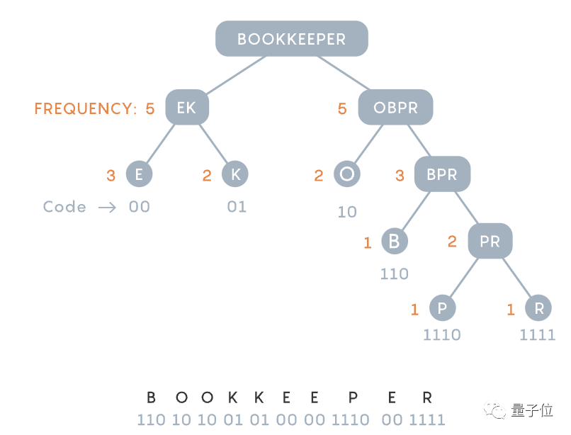 相比之下,哈夫曼的方法,比如就从不常见的r和m开始,将其组合成一个字母对。