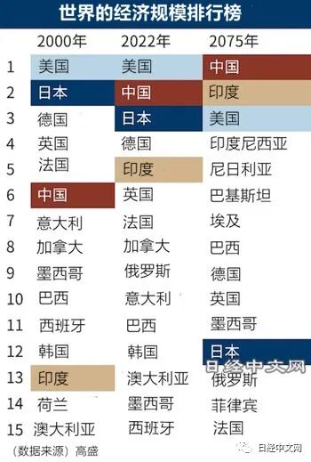 高盛做了个2075年的全球GDP排名预测:高盛预测第一名是中国、第二名是印度、第三名是美国......日本则是第12名!低于德国和英国。