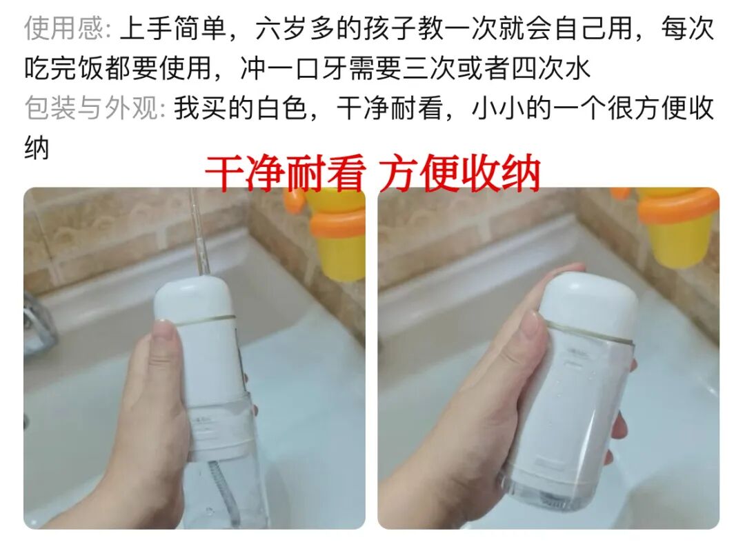 我还采访了CC同学,她说:“医生推荐用,后面用着用着就戒不掉了,本来戴牙箍就容易卡食物,以前刷牙刷半天,现在每天冲牙器1分钟搞定,贼爽~”