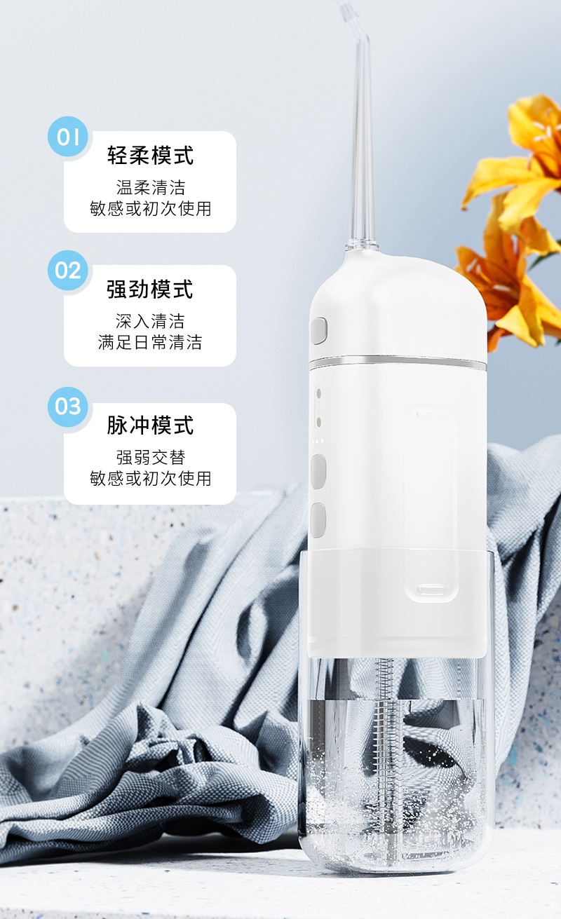 轻柔模式:水流柔和,适合口腔敏感和初次使用人群。