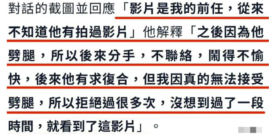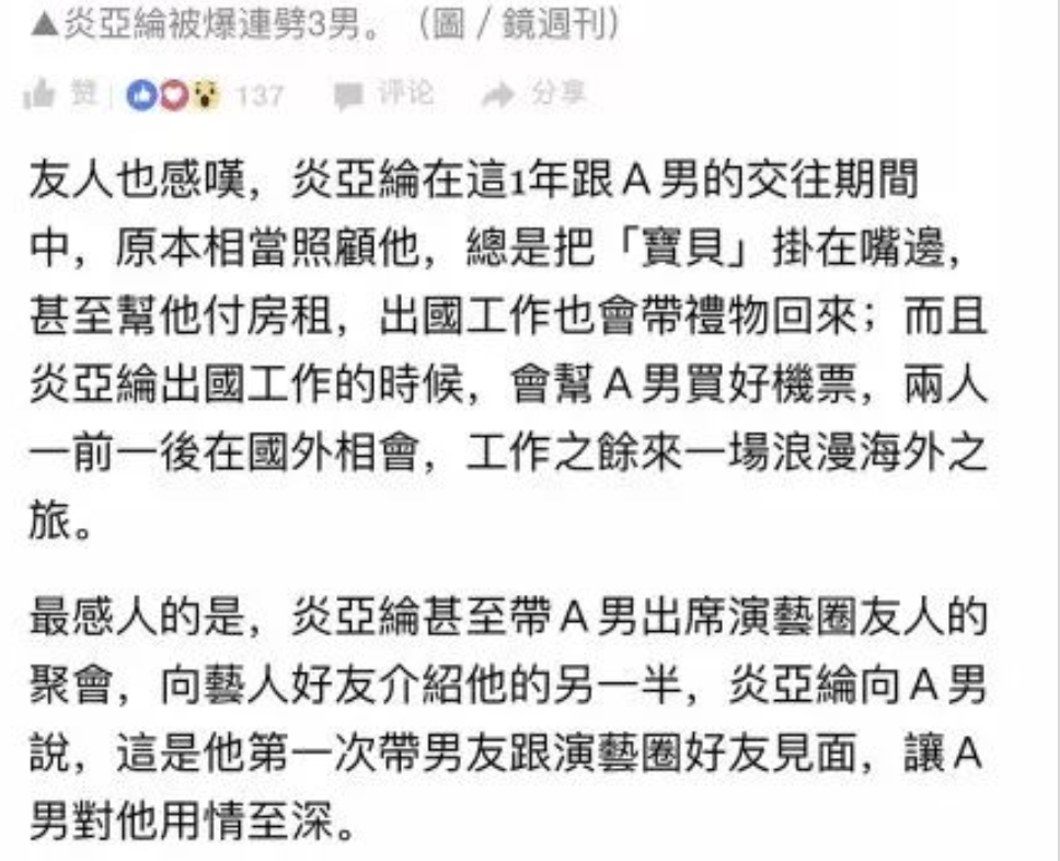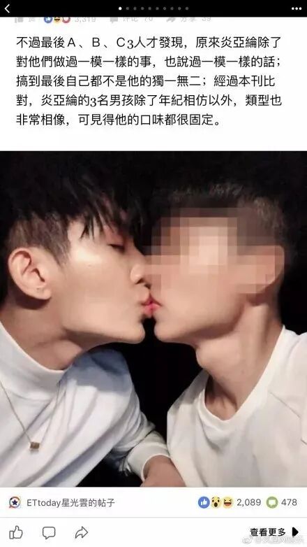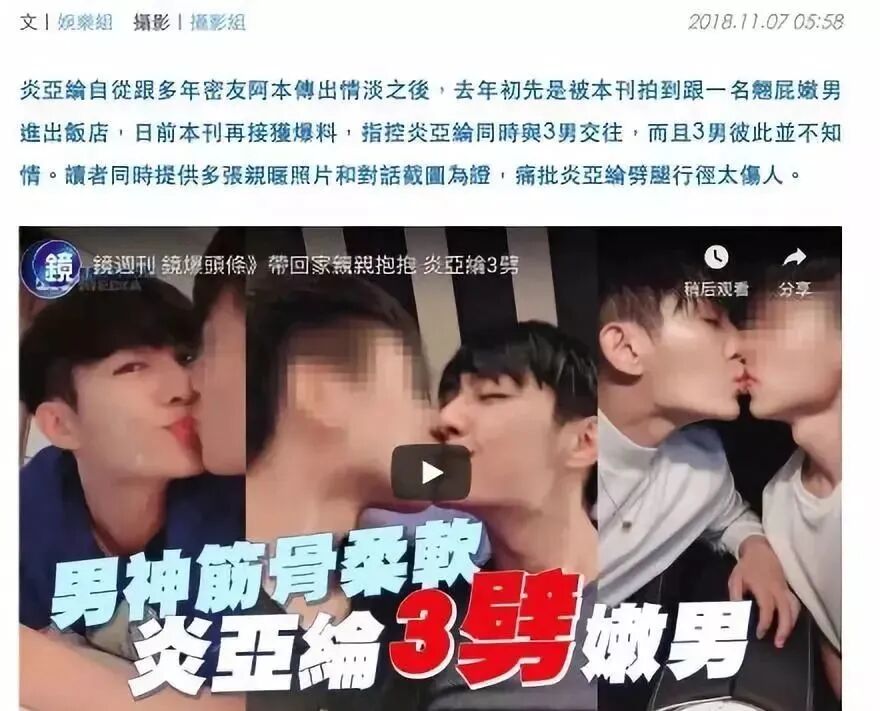 谁知两人相识后,炎亚纶不顾他只有16岁,与他发生了关系,还在他明确拒绝的情况下偷偷拍了小视频。他以为两人是有感情的情侣,却常常半夜接到其他炎亚纶同时交往的对象的电话威胁。后来小视频外泄,对这个男生的生活产生了毁灭性打击。炎亚纶只给了几万台币打发他,再问就是威胁说“你要是爆料的话,会找黑道来解决你“。我查了一下,小视频外泄这件事,目前还能找到2018年的新闻出处——当时邱耀乐并没有曝出炎亚纶的名字,只说是前任劈腿,两人分手后没联络,闹的很不愉快。至于他说的半夜接到炎亚纶同时交往的男生的电话这事儿,其实2018年也有过媒体爆料。