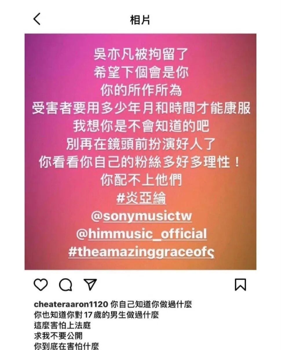 这两天,这场台娱地震又猝不及防地炸出了另一个明星——飞轮海的前成员炎亚纶。一个叫邱耀乐的男性网红在ins上连发声明,控诉炎亚纶在他16岁时性侵自己。一开口就讳莫如深,“吴亦凡被拘留了,希望下个会是你。”还晒出了两人的聊天记录,大概意思是炎亚纶“做贼心虚”,已经认了这件事。随后,这位网红切了大号,实名把他与炎亚纶的恩怨一五一十地曝光了。