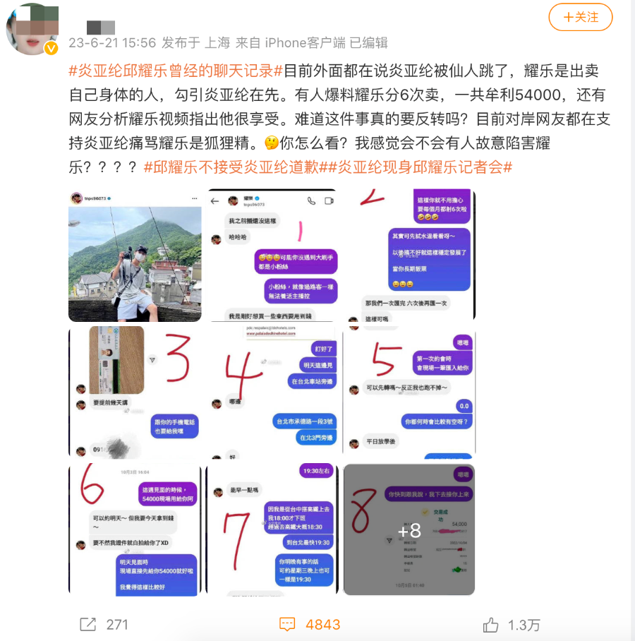 11月,台媒曝光炎亚纶劈腿a、b、c三个男生,还晒出了他与三人激吻的照片。据镜周刊所说,炎亚纶在跟a交往时,原本很照顾他,又是付房租又是带礼物,还介绍他认识自己演艺圈的朋友。没想到没过多久炎亚纶态度转淡,a才发现他还有另外两个男友,且对他们做过一模一样的事,说过一模一样的话。五年过去了,随着me too运动的爆发,邱耀乐的这次曝光,将事件升级成偷拍和泄露。炎亚纶回应也很快,发文直面事件,承认与对方有过一段关系,也承认视频的存在和外泄。事实上,炎亚纶的性取向早就不是秘密了,社交媒体上全是蛛丝马迹。但他把自己拍别人小视频以及与未成年人发生关系这件事,归结于“恋爱脑”,就着实令人无语了。至于被泄露的私密视频,他在ins上解释说是修手机时被外流的。但2018年视频泄露时,邱去质问他,他却理直气壮地说,“我要问你,你怎么反问我?”更绝的是,今天早上邱耀乐开发布会,邀请了一众媒体到场。又是鞠躬道歉,又是崩溃痛哭,哭喊着称自己没有做任何强迫意愿的事情,然后泪眼婆娑地离开了。画面非常真实,炎亚纶抬着头,是恰好能被记者拍到泪流满面的角度。坐在桌子前的邱耀乐毫不知情,见对方出现,当场错愕。炎亚纶拿着话筒道歉时,邱一眼都不敢看他,直接趴下痛哭,紧握双手,几度抖动,情绪崩溃。“看似是去道歉认错,其实只是耀武扬威地去给受害人施加二次伤害罢了。”有人曝出邱耀乐曾经出卖过自己的身体,6次卖了54000元,疑似聊天记录如下:很难说,炎亚纶是否知道这则爆料,又或者这料到底是谁放的?为什么放?