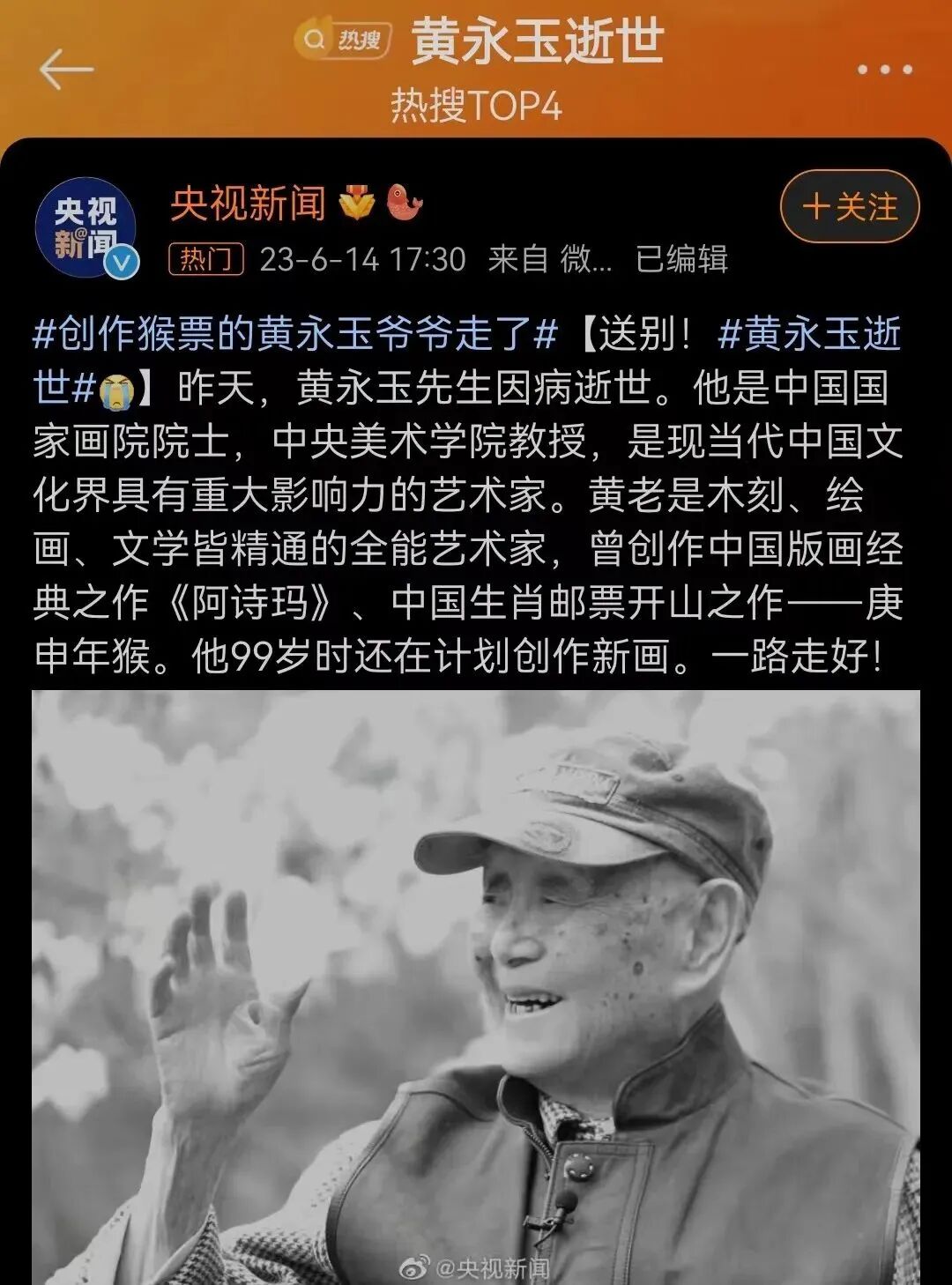 在2023年6月13日,中国国家画院院士、中央美术学院教授黄永玉先生逝世。出生在战争年代的黄永玉,见过战争硝烟,也经历过时代变迁,挨过饿、受过穷,但从苦和痛中,他还是活出了不同寻常的乐观豁达。
