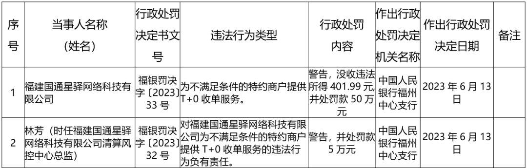 6月16日,人民银行福州中支发布多个罚单,其中国通星驿因存在“为不满足条件的特约商户提供T+0收单服务”的违法行为,被警告,没收违法所得401.99元,并被罚50万元。