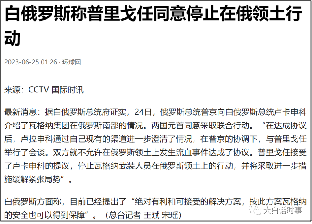 白俄罗斯的通报里是说,在普京协调下,卢卡申科和普利戈任进行了会谈,才最终达成协议。
