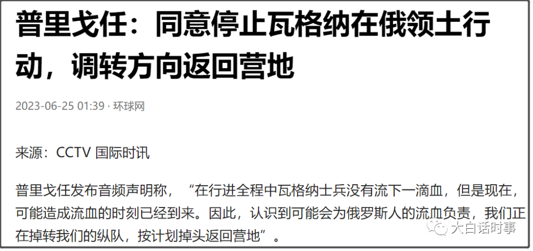 普里戈任也在同一时间,发了段音频称,“在行进全程中瓦格纳士兵没有流下一滴血,但是现在,可能造成流血的时刻已经到来。因此,认识到可能会为俄罗斯人的流血负责,我们正在掉转我们的纵队,按计划掉头返回营地”。