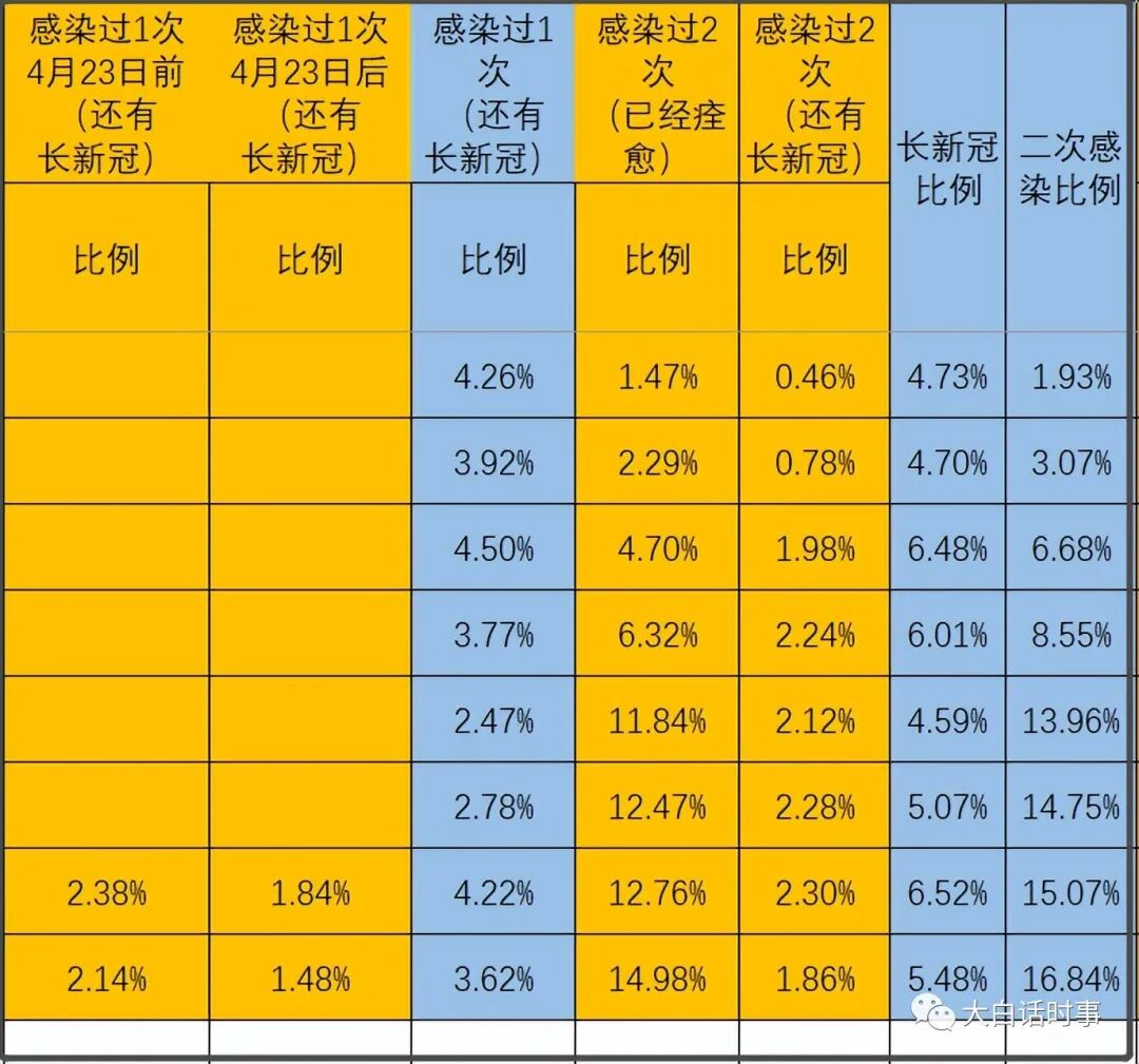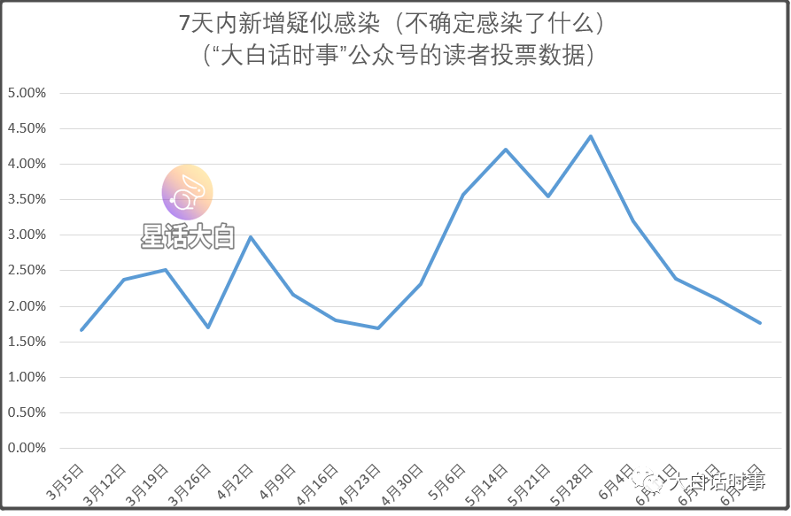 从我长期观察看,在投票人数达到5000人的时候,各选项比例基本跟1.5万人时候的比例,变化不会太大。也说明我上个月判断6月底本轮疫情结束的判断,概率增加了。7天内新增疑似感染的比例也持续下降,从上周的2.1%,下降到本周1.76%。目前疫情已经过峰的判断,是针对全国普遍情况来说,更多反映的是5月初疫情就开始的一线城市。一些疫情稍微滞后的三四线城市、乡镇等,可能会有一些滞后差异,但应该顶多也就滞后半个月。所以,我还是维持上个月判断,7月中旬全国范围内,本轮疫情就暂告一段落。在上周区分了4月23日之前还有长新冠,以及4月23日之后还有长新冠后。我们可以发现,4月23日之前感染过1次,还有长新冠的比例还有2.14%这个比例从3月份的10%,一路下降到4月份的5%,再到现在2.14%,是持续下降。这也说明,长新冠患者随着时间推移,会有概率持续自愈。其次,去年底第一波疫情感染,到现在已经有6个月时间,长新冠持续至今的比例有2.14%,这其实已经足够让人们应该重视长新冠问题。长新冠持续超过6个月时间,有2.14%这个比例,并不低了。现在全世界都得重视,长新冠这个人类整体慢性病的问题。可以看到,本轮疫情里,新增长新冠的比例,首次感染是1.48%,二次感染是1.86%,合起来差不多是新增了3.34%的长新冠患者。这个新增人数,刚好跟过去这两个月,原先长新冠患者比例下降幅度差不多。从长期来看,会持续有一部分长新冠患者自愈,也会有一部分新增长新冠患者,最终达到一个动态平衡,使得长新冠比例长期维持在3%-7%之间。1、我的读者整体防护意识应该好于社会面,所以读者感染率会比社会面实际感染率要低。2、多数人二次感染的症状比较轻,而且抗原检测容易检测不出来,应该有不少人是二次感染了,但实际当做感冒,并不觉得自己感染。这个在社会面里比例应该会比较大。所以,我个人是猜测,这波疫情结束的时候,社会面感染率可能在60%左右。我读者里本轮疫情最终感染率,可能在45%左右,应该会比社会面感染率低15%左右。我觉得,如果能做好防护,顶多也就是把感染率下降15%左右。做好防护,不能保证我们一定不感染,但只要能降低感染概率,就是意义的。虽然不少人做好了防护,最终也感染了,在个体上可能会感到气馁。但做好防护的意义,会体现在避免感染人群上,也会体现在大数据上。在疫情高峰期做好个人防护,在疫情低谷期保持放松,恢复正常生活。因为我看到有的人,有做好防护,但在感染之后,就有些自暴自弃,觉得防护无用。这就是缺乏自我预期管理,出现心理破防,容易从一个极端,到另外一个极端。除了防护之外,新冠的持续存在,也在不断提醒我们,平时做好健康管理的重要性。不要熬夜、保持好作息,多吃水果,多补充维生素C,多保持愉悦心情,都有助于我们免疫力。在疫情常态化的现实面前,我们也只能接受现实,避免焦虑。所以,我在呼吁大家要重视疫情,重视自己健康的同时,基本也都会不断跟大家做心理按摩。比如,经常听到有人说,以后没有疫情低谷期,要全年时刻面对疫情,我是比较反对这种说法。那些说疫情没有低谷期的人,理由是说,现在感染率没有去年12月集中过峰那么高,就会长期持续感染。去年大多数国家,都有3波比较明显的疫情,两波疫情基本都有4个月左右的低谷期。日本是比较典型的,去年3月一波疫情,8月一波疫情,12月一波疫情。并且,日本今年1月疫情高峰期后,一直到上个月才出现新一波疫情。日本疫情都经过9轮了,长期反复感染后,今年也还有4个月的疫情低谷期。而且,日本整体社会防护意识比我们强,虽然实际感染率肯定没有日本官方数据那么低,但理论上日本的感染率应该会比我们低一些,可能是每轮50%左右的感染率。日本感染率会比我们低一些,都有明显的高峰期和低谷期。我们整体社会缺乏个人防护,感染率比日本高,更不可能没有低谷期。只不过,7月-9月份,这段疫情低谷期,可能并没有2-4月份,低谷得那么彻底。去年12月是集中过峰,导致2-4月低谷得很彻底,大多数人基本都感知不到疫情存在了。今年7-9月,虽然仍然会有低谷期,但可能低谷得没那么彻底。4月23日之前,7天内新增新冠感染比例是一直维持在0.3%的超低水平。我估计,在7-9月的低谷期,7天新增新冠感染比例可能会维持在1%左右,这个水平会比2-4月高,但还是有明显的低谷期。综合来说,我觉得7-9月应该会进入到低谷期,10月份才可能出现下一波疫情。疫情低谷期,不代表完全不会感染,仍然会有一个低水平、低烈度的局部传播,这个传播可能比上一波疫情低谷期稍微高一些。所以,我建议大家7月开始,可以放松,不用那么高强度防护,但最好还是有一些基本防护,比如出门戴口罩,勤洗手等等。我这个投票,更多是希望能帮助到大家,可以帮大家确认是否进入疫情低谷期。下周,我打算根据投票数据的结果,解除自己最高强度的防护,只做基本防护。这轮疫情里,我和小白都没有感染,我觉得这些辛苦还是值得的。在疫情高峰期,根据自己实际情况,适当加强个人防护。只有这样劳逸结合,在疫情常态化的情况下,才能有可持续性。现在疫情常态化,我们想要保护好自己健康,确实很难。