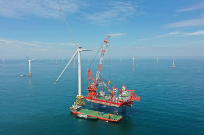 ▲图为全球首台16兆瓦海上风电机组吊装现场。(新华社发)