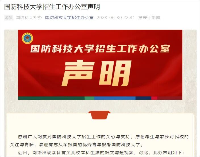 据微信公众号“国防科技大学招生办公室”消息,近日,网络出现众多有关该校本科生源的帖文与短视频,对此,国防科技大学招生办公室声明如下:一、网络涌现的涉及到所谓“状元”放弃XX学校报考我校的帖文或短视频,绝大多数内容不真实。二、各高校之间的办学定位、办学特色与办学优势虽有不同,但都在为国家的人才培养和科技进步共同努力。我办不认同部分视频中对不同高校之间的不恰当对比与相关言论,期待大家共同维护正向、正能量的网络环境。三、作为中央军委直属的综合性研究型高等教育院校,我校期望的优质生源,除了高考分数、政治考核、面试、体检这些硬性指标外,还应具备以下素质条件:思想上进、志向远大,有家国情怀和献身国防意愿;学业优秀、基础扎实,有较强的求知欲望和创新潜质;意志坚强、不怕吃苦,有一定的抗压能力和抗挫折能力;身体健康、品行端正,有健全人格、阳光心态和良好体质;遵纪守法、自律自强,有服从军校集中统一管理的思想准备。四、在社会价值观日趋多元的今天,期待更多优秀青年能够将个人的成长进步与国家发展、民族复兴和国防强大同频共振,为理想而奋斗、为人民而奉献、为祖国而担当!下面占豪定制酒都是上等好酒,但性价比都很高!千元以上酒体品质,包装高级、设计精美,酱香浓香都有,适合招待贵客与收藏!返利抵25%,再赠100%返利+重磅礼品,性价比超高!详情查看下边内容,点击下图购买来自茅台镇7.5平方公里核心产区。茅台镇特有红缨子高粱+赤水美酒河水源,经“12987”传统大曲酱香工艺,10年陈基酒+系列30年老酒+科学勾调,形成入口柔和、酱香浓郁、丰满醇厚、爆发力足、回味悠长、层次丰富的屯亨酱。酒体清澈透明微黄,挂杯如露,粮香、曲香、陈香伴随舒适果香、花香、烘焙香,让人舒心。生活馆优惠价799,25%返利全抵后599.25元/瓶,平台再赠100%返利,相当于“0元购酒”。厂家还再赠至高1580元赠品,力度强大,点下图购买,充预付卡优惠更多好礼相赠!点蓝字充值占豪与非遗传承人康庆坊张薛飞联手打造,正宗泸州浓香,清雅细腻丰满协调,入口绵柔甘醇回味悠长,品质不输某73某粮液。占豪分享“参悟、观世、诚心、恒力”四大主题与未来展望。除100%返利和25%抵扣外,买2箱还赠6瓶500毫升规格如济醇纯粮酒+2瓶品鉴酒,点下图购预付卡优惠更多好礼相赠!点蓝字充值中国“窖父”赖高淮亲酿亲调,闻香优雅,粮香突出,窖香浓郁,陈香舒适,酒线绵长,酒体粘稠,入口柔顺甘甜,回味悠长。内含占豪16万字《谈未来》,畅谈中国面临前所未有之挑战。瓶身晶莹剔透、光洁可鉴。附赠高档酒具。100%返利+25%抵扣,买1箱赠2瓶品鉴酒或定制水晶玻璃酒杯2套;2箱赠4瓶品鉴酒+酒杯2套。点下图购预付卡优惠更多好礼相赠!点蓝字充值
