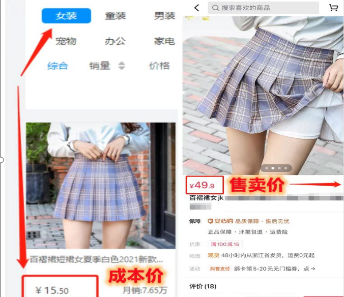 她的店铺卖的是连衣裙,上架了夏季产品,标价49.9元,然而在公司提供的货源渠道下单只要15.5元,一件代发后我们的利润就是34.4元。