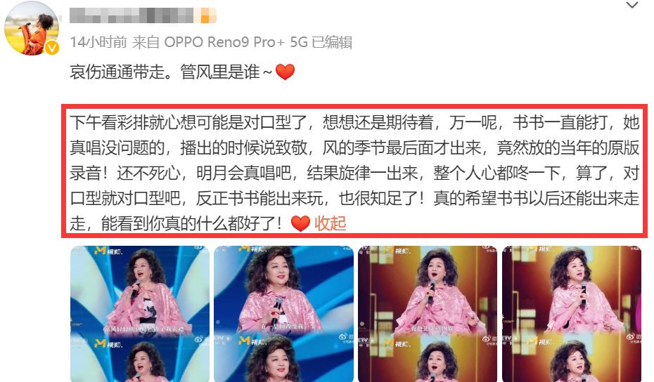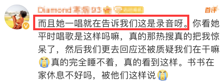而且,不只一个粉丝听出了是假唱,毕竟现场的声音和录音是一模一样的,即便实力再强,加上这么多年没在舞台上演唱,也很难达到和录音一样的效果。粉丝看到她在彩排的时候,已经猜到她这次是对口型演唱,并透露播放的是当年的原版录音。尽管有些小失望,但粉丝看到她能出来,就已经很满足了。