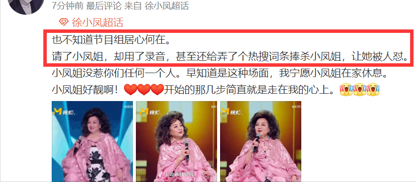 粉丝们甚至质疑节目组的用意,明明把小凤姐请出来了,却用了录音,给小凤姐带来了一个热搜词条,让她遭到质疑,粉丝们在知道这样的情况下,宁愿小凤姐在家休息。