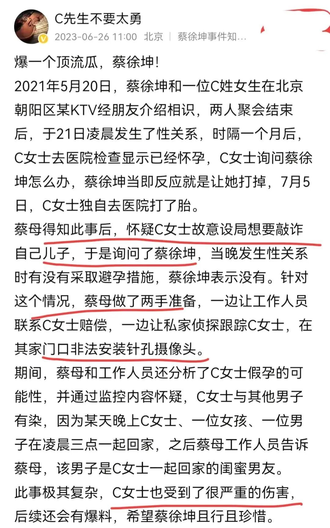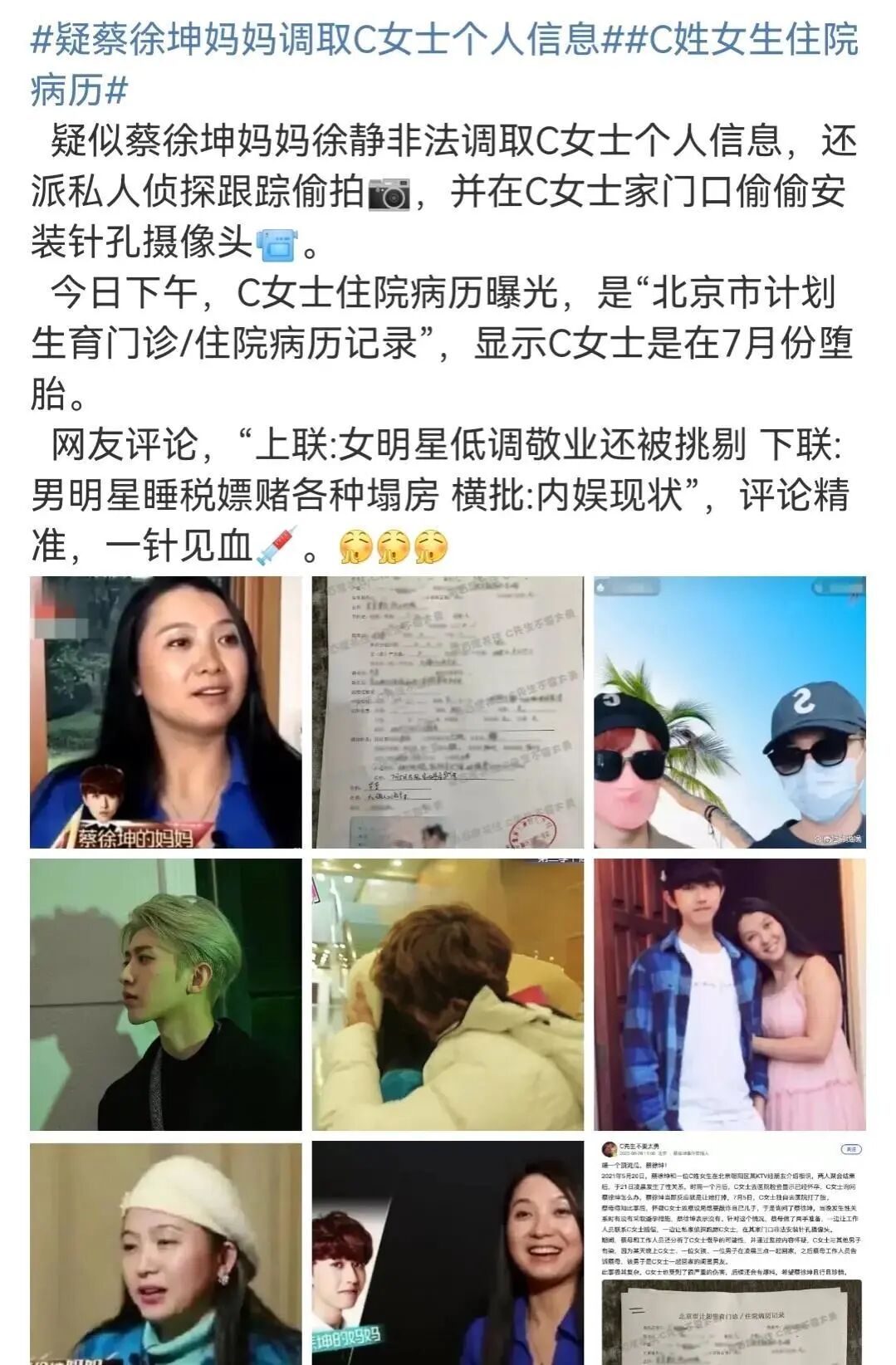 在蔡徐坤被狗仔队抓拍到的疑似一夜情事件中,可能导致C女士怀孕并选择堕胎,这个新闻爆出后,他的社会形象在全网迅速坍塌。