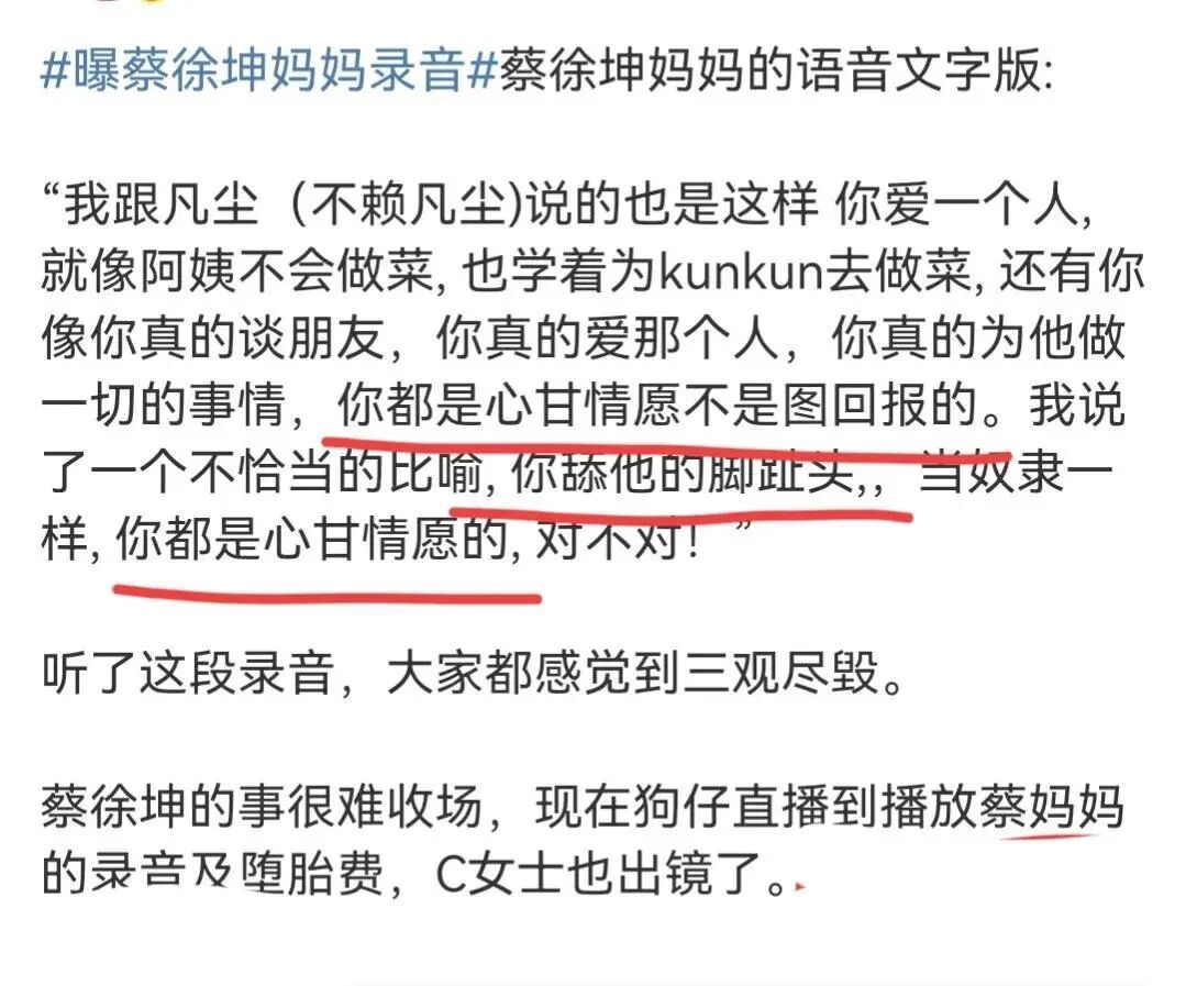 录音中,蔡徐坤的母亲徐静强调,粉丝们如果爱蔡徐坤,就应该像舔足一样......
