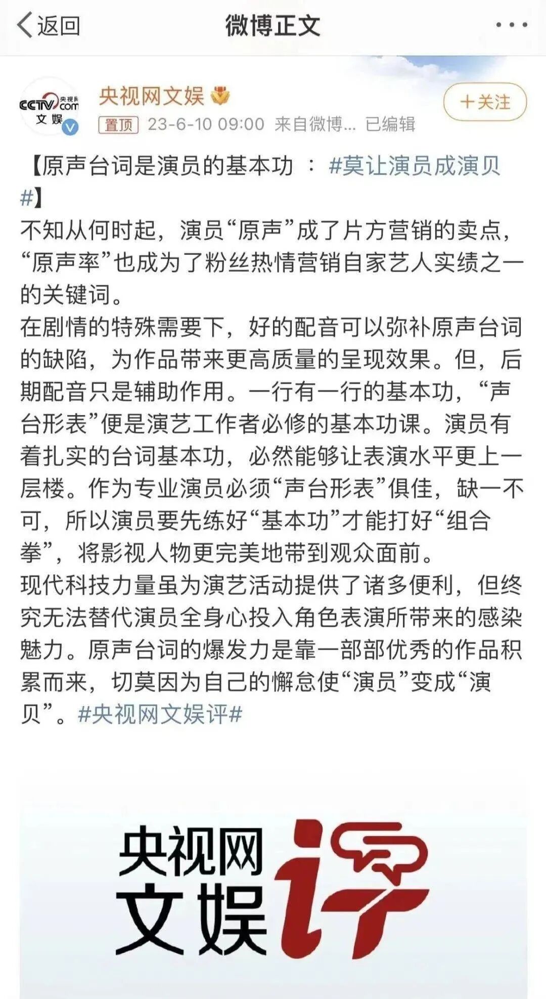 除去演员变为“演贝”外,现如今的演员使用原声也演变成了一种值得被夸奖的事情,忽视了这本就是演员应当具备的基本功。