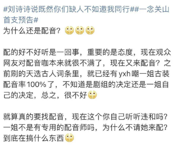 比如人淡如菊的85花刘诗诗,淡到也不追求原声出演,在《一念关山》中坚持使用配音,不敬业的样子让粉丝大破防,集体跑到工作室微博下面声讨,一副恨铁不成钢的样子。