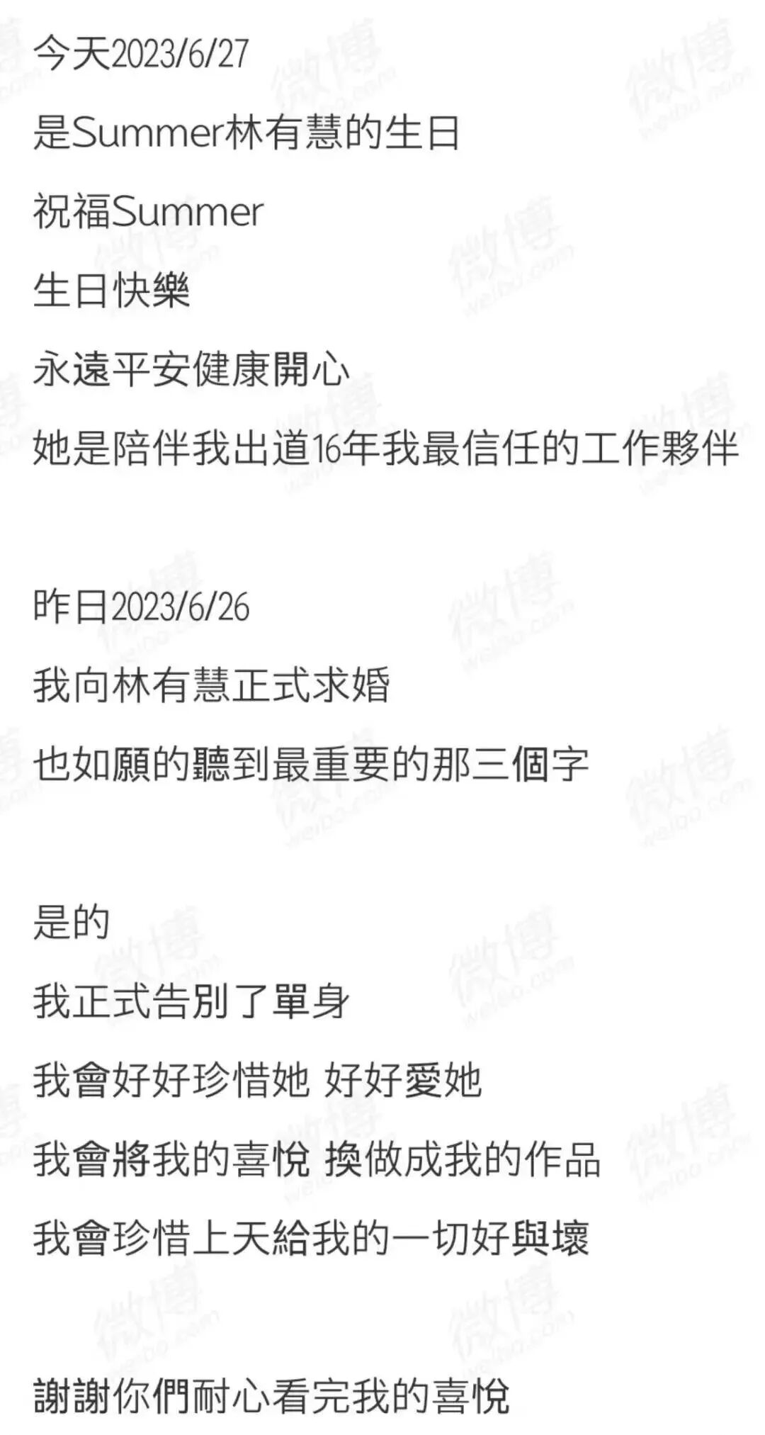 而如今,我更是拥有了真挚的爱情,一个美满完整的爱情。我感到非常高兴能走到人生的这一阶段,期待大家能为我送上祝福,同样,我也祝愿你们能找到属于你们自己的幸福。”