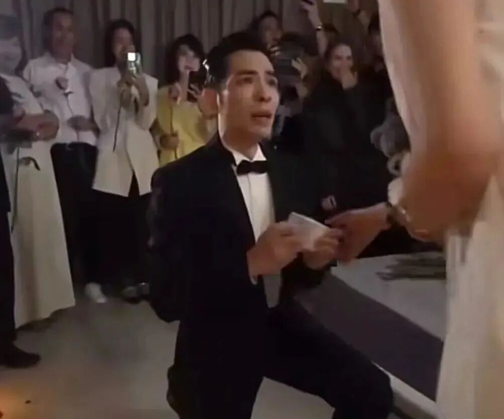 接着,当看着萧敬腾拿出戒指,把戒指戴在她的手上时,她情绪激动地大喊道:“我愿意!”