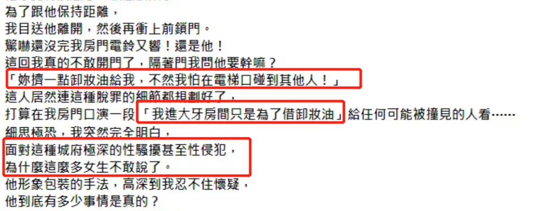 大牙在长文中也指出,陈建州在她告诉他有朋友即将来找她后才离开房间,而且又返回来要求她借一些化妆品。陈建州的行为透露出他极其谨慎,他担心被其他人发现,因此他预备好了一切可能的借口,这种行为让大牙感到恐惧。