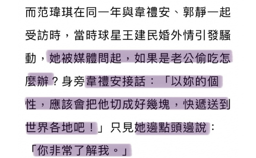 此外,一些媒体还翻出了以前范玮琪对陈建州的评价,当被问到如果陈建州出轨会如何处理时,范玮琪的朋友曾打趣说:“你肯定会把他切成好几块,然后寄送到全世界各地。”范玮琪笑着回答:“你真的很了解我。”