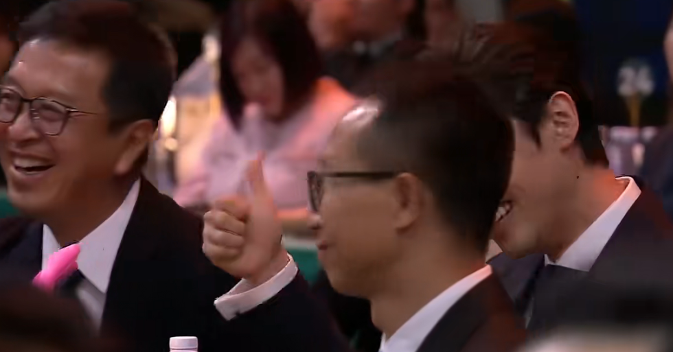 他首先哈哈大笑,然后竖起了大拇指,似乎正在和旁人讨论吴越获奖的事情。