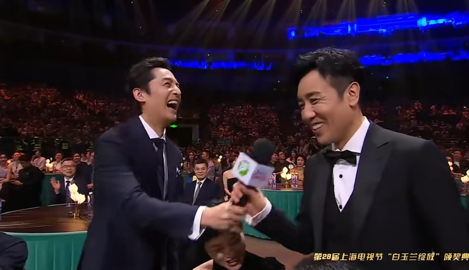胡歌满面笑容,郭京飞先是微笑,然后被雷佳音的一句“这个奖是颁给所有人的,我只是代领一下”逗得笑不拢嘴。