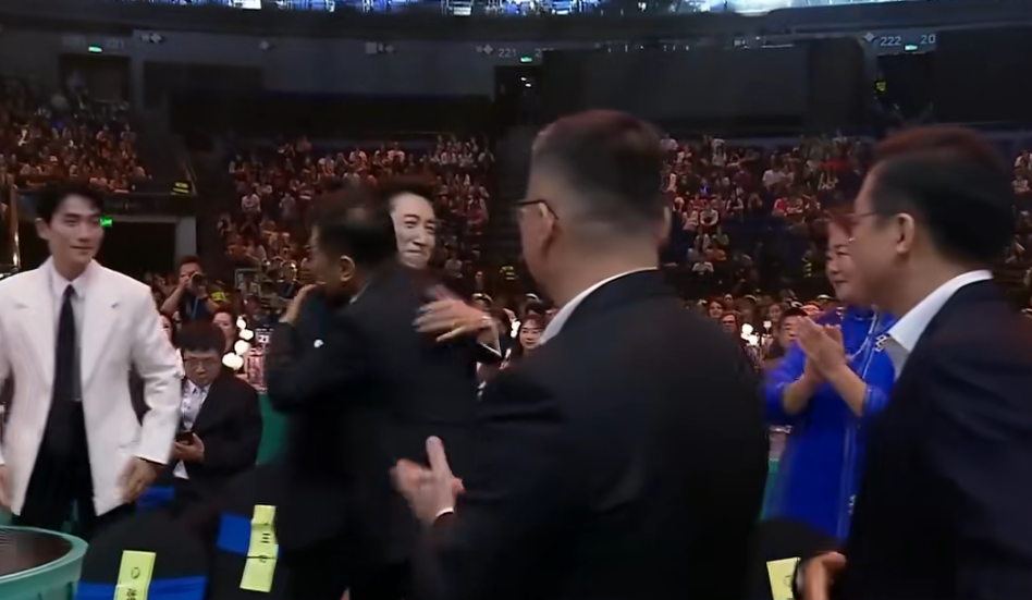 他在给予掌声的同时,目光四处游走,似乎在寻找丁勇岱的身影。而王阳收起了自己的失落,立即微笑起身,与丁勇岱热烈拥抱。