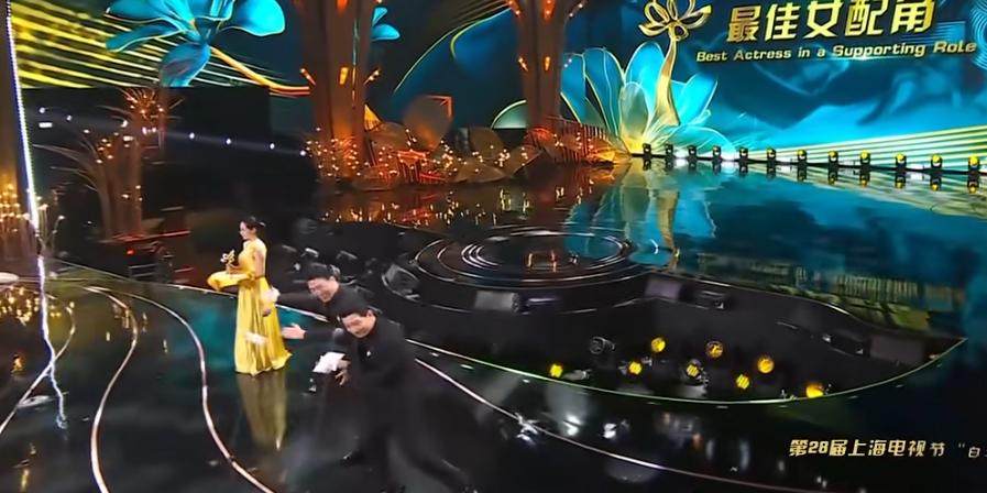 她上台领奖的时候,似乎走错了路,让颁奖人王耀庆和田雨急忙弯下腰、伸手为她指路。