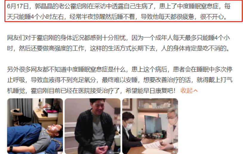 不久前,霍启刚接受了一次采访,在采访中他透露了一个秘密,他受到严重的失眠障碍和中度睡眠窒息症的困扰。这意味着他很难入睡,并且在睡眠中会出现短暂的窒息症状,这对身体的影响非常严重。