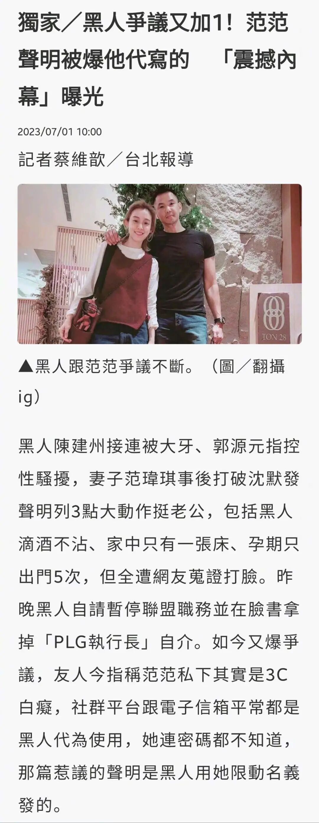 今天WW鱼圈关于陈建州的消息又更新内容了,进度发展到有自称是范玮琪友人的出来透过媒体发声,称女方是电子白痴不会玩账号这类,所以网上的发文都是男方一手策划发出。这个话题立刻引起讨论且被视为是女方有意要跟男方割席,然而就在不久前又有媒体拍到男方低调外出,开的是老婆的车疑似还跟女方同行。