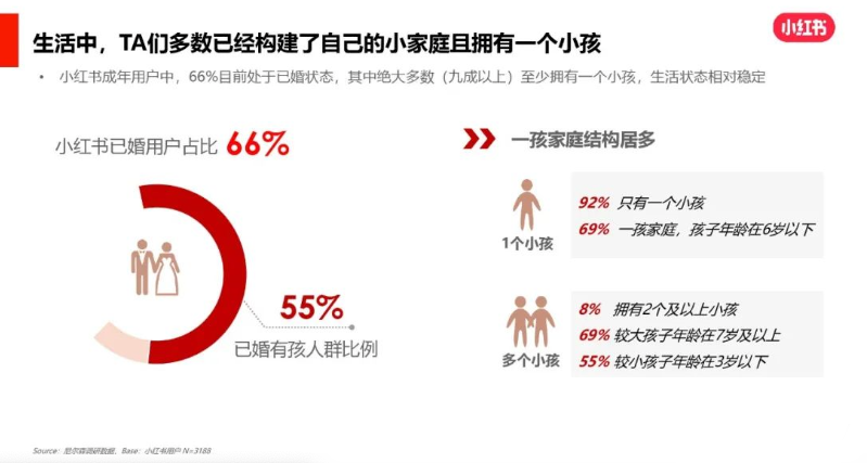 据了解,小红书平台上像芽芽妈这类妈妈用户非常多。2022年12月官方数据显示,月活用户超2.6亿的小红书中,女性占比70%(小红书也因此获得“好产品的种草平台”的称呼),成年用户中68%处于已婚状态,在此基础上有孩子家庭占比近9成。