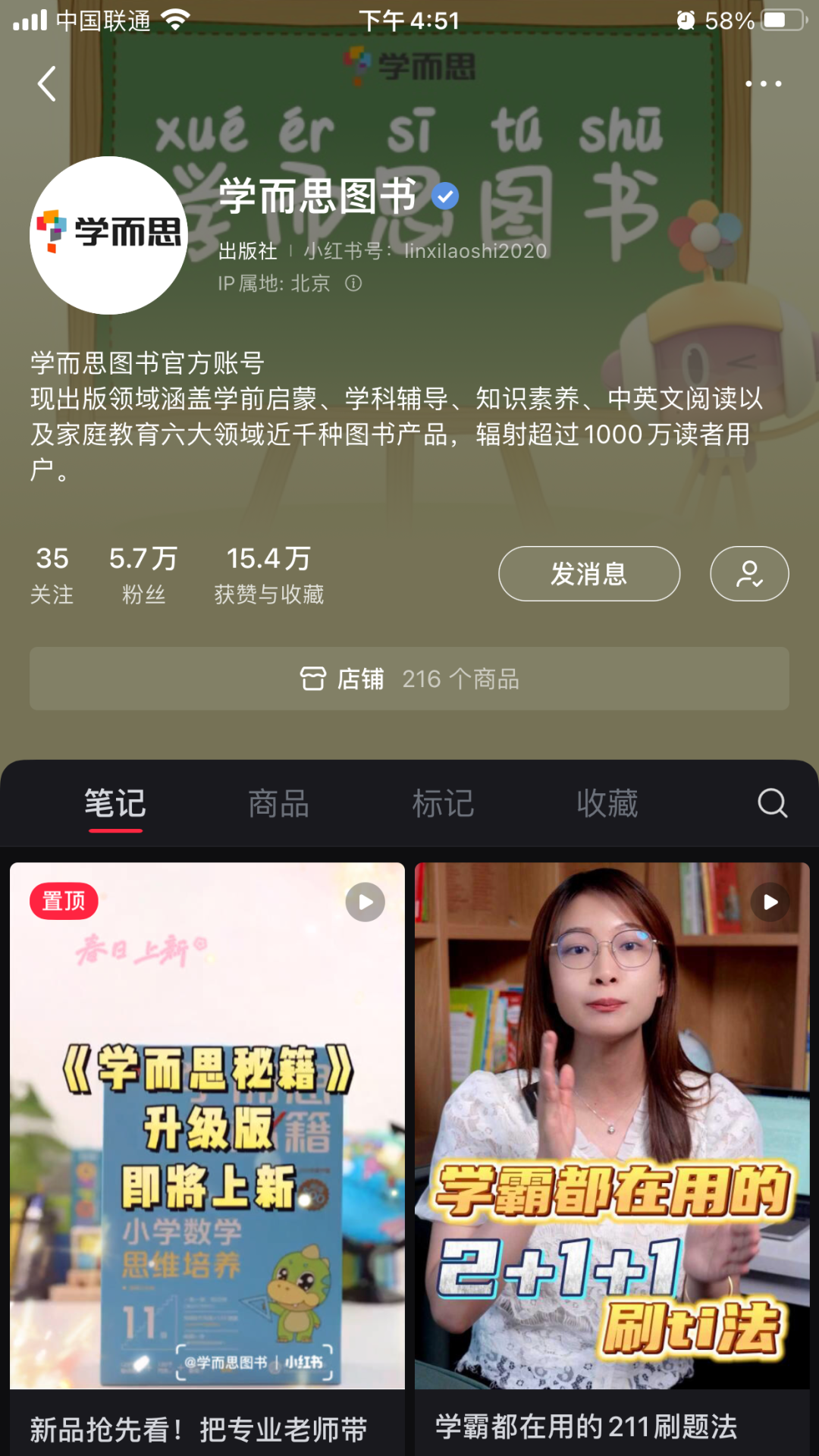 2021年初,教培行业另一巨头好未来也开始悄悄行动,开通了学而思图书官方账号,涵盖学前启蒙、学科辅导、知识素养、中英文阅读以及家庭教育六大领域,店铺上架 215个商品,目前粉丝5.7万。另外是学而思网校官方账号,定位为专注素质教育的在线学习平台,目前粉丝10万,获赞与收藏 45.9万。